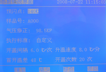 1)在此界面中預閃點、樣品號、氣壓、標準和時間,都可按提示進行調整,修改完成后按【返回】鍵。回到主操作界面。