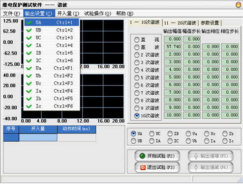 在微機繼電保護測試儀中部的輸入框中設置“輸出幅值”、“幅值步長”、“輸出相位”、“相位步長”,微機繼電保護測試儀各電壓、電流的各次諧波幅值在界面上以“伏特”或“安培”為單位顯示其值,微機繼電保護測試儀輸出的值為界面上實際顯示的電壓電流大小。變量的變化步長應根據測試的要求選擇合適的大小,一般地,步長越小,測試精度越高。